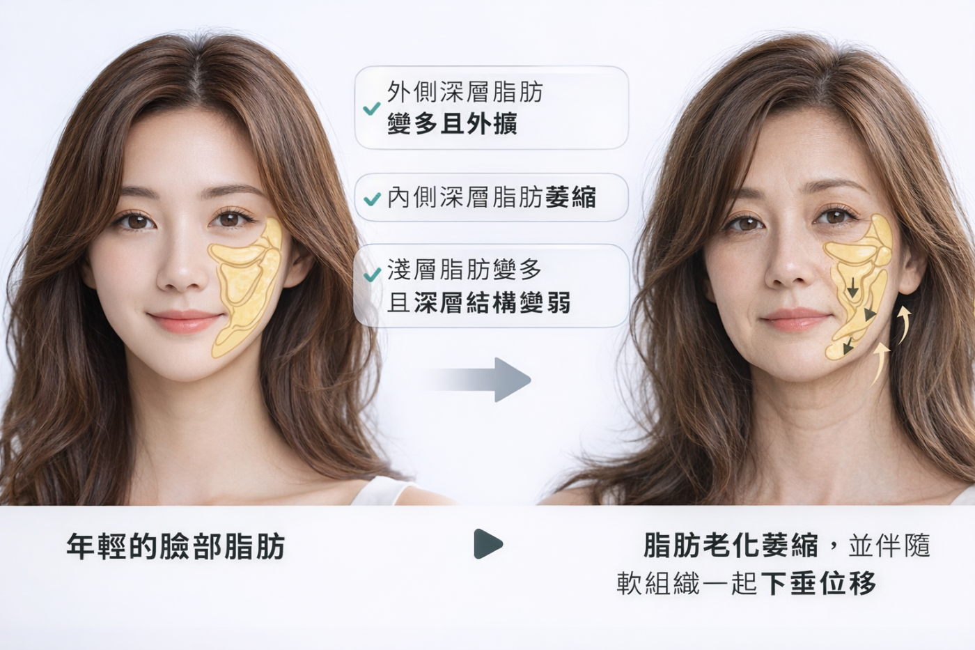 肌膚從 20 歲開始,隨著膠原蛋白逐漸流失進而浮現老態樣貌,20 歲前臉頰膨潤、緊緻有感,擁有年輕樣貌;30 歲開始,肌膚老化問題逐漸嚴重,皮下組織結構變弱,除了產生細紋、皺紋,脂肪也變得老化萎縮、位移,導致雙頰鬆弛下垂、老化型雙下巴浮現,顯老的特徵更明顯。